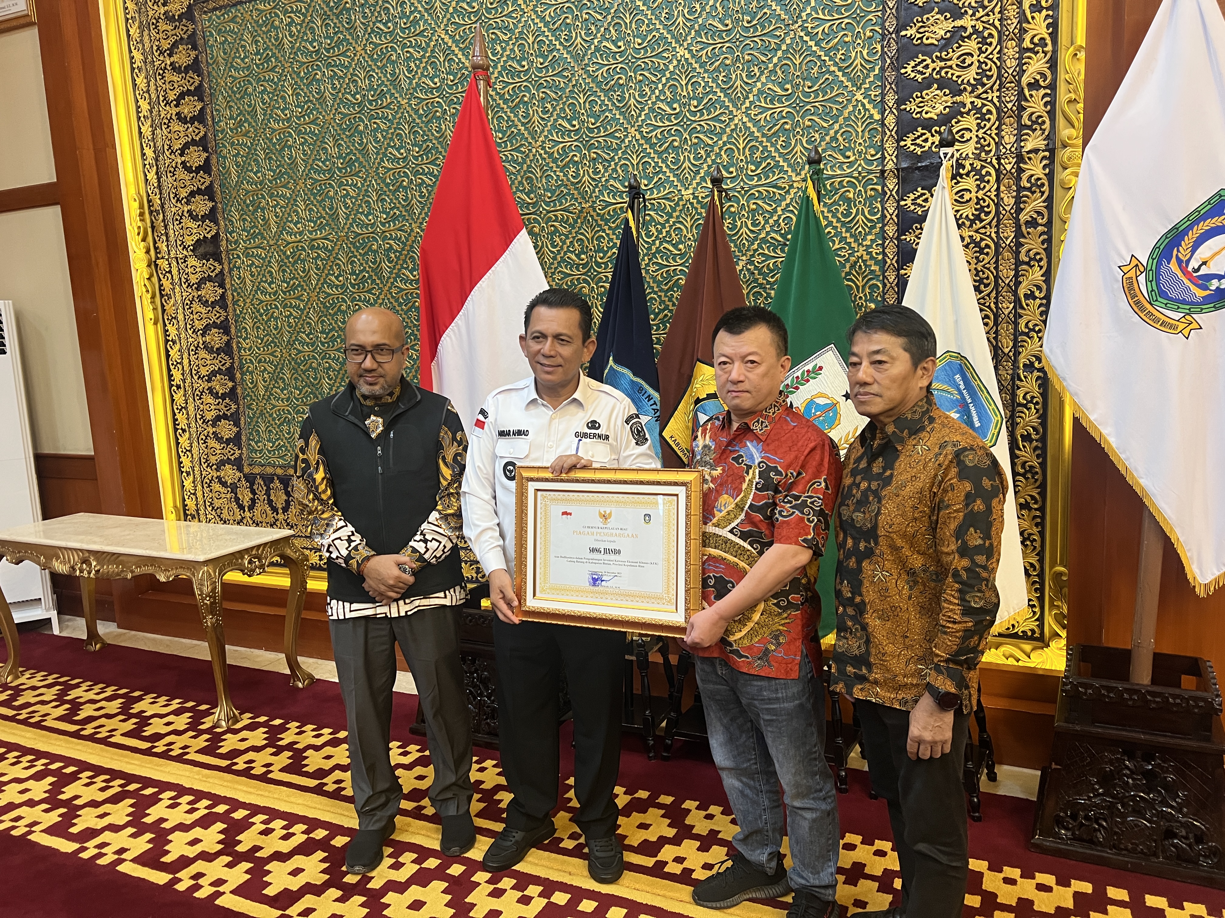 為表彰南山控股董事長宋建波先生對印尼廖內群島省建設發展做出的卓越貢獻,2023年12月28日,廖內群島省省長安薩爾·艾哈邁德(Ansar Ahmad)在廖內群島省政府為宋建波董事長頒發了“廖內群島省投資與發展卓越貢獻獎”。