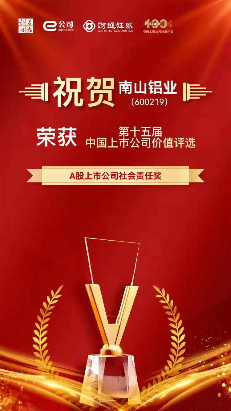 9月28日,由證券時報社主辦、財通證券特約協(xié)辦的“第十五屆中國上市公司價值評選”榜單揭曉,南山鋁業(yè)榮獲“A股上市公司社會責任獎”。