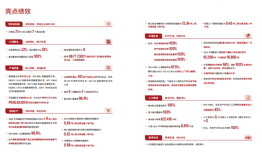 近日,南山鋁業(yè)發(fā)布了2021年環(huán)境、社會及管治(ESG)報告,這是公司參照上海證券交易所相關(guān)準則、回應聯(lián)合國可持續(xù)發(fā)展目標及MSCI ESG評級指標所編制的首份ESG報告,也是公司發(fā)布的第12份社會責任報告。本次報告依據(jù)宏觀政策導向,結(jié)合利益相關(guān)方的關(guān)注和訴求,對標行業(yè)優(yōu)秀企業(yè),開展各類利益相關(guān)方訪談,識別出了21項ESG議題和7個重點議題,詳盡闡述了2021年南山鋁業(yè)在ESG領(lǐng)域取得的亮眼業(yè)績,讓大眾看到了一個落實企業(yè)責任、堅守長期主義、可持續(xù)發(fā)展的南山鋁業(yè)。